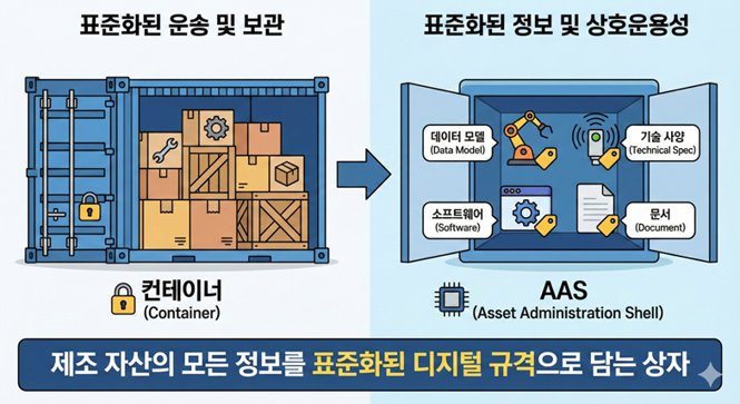 이를 위해 2023년 제정된 제조 데이터 국제 표준 'AAS(Asset Administration Shell, 자산 관리 쉘)'는 인더스트리 4.0을 구성하는 물리적 실체(기계, 장비 등)와 디지털 세계를 이어주는 관리 쉘이다.